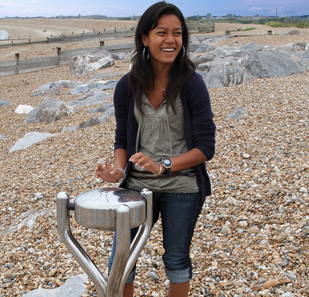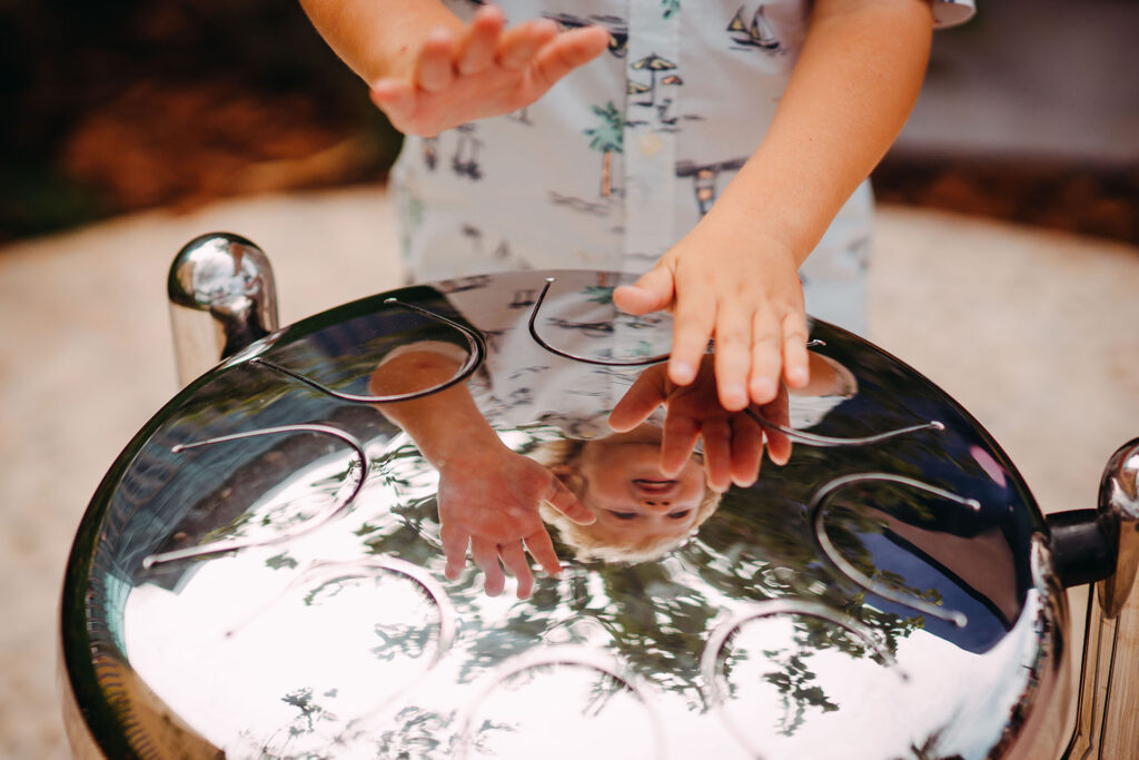 Fabricated of stainless steel the Large Babel Drum has been carefully tuned to replicate the sweet sound of steel pans. Played with the hands, preferably by striking with the fingertips, the 8-notes produce perfect musical tones. The Large Babel Drum is tuned to the G major pentatonic scale G3-B4. The drum creates beautiful melodies with remarkable long sustain. No previous drumming experience required to produce mesmerizing mellow tones. Available in large and small.