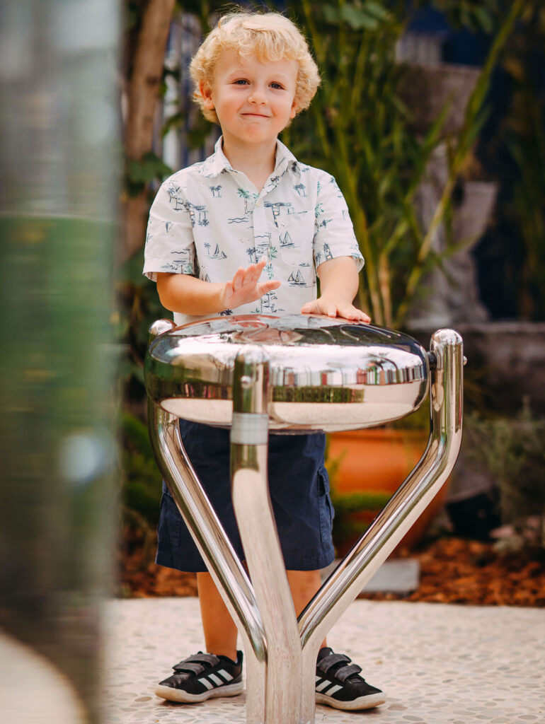 Compact but complex, Ripple combines four elements of water play in a balanced arrangement that can accommodate many children at the same time. A winder pump releases water into a channel that splits into two, with each side controlled by a hand-controlled dam. One branch leads to a water wheel driven by the kinetic force of falling water and the other leads to a splash table. It is possible to maintain eye contact from any point in the system, encouraging collaborative social play and interactive engineering. From toddlers to parents, everyone can find a way to engage in the stimulating, fun, sensory water play this system provides.
