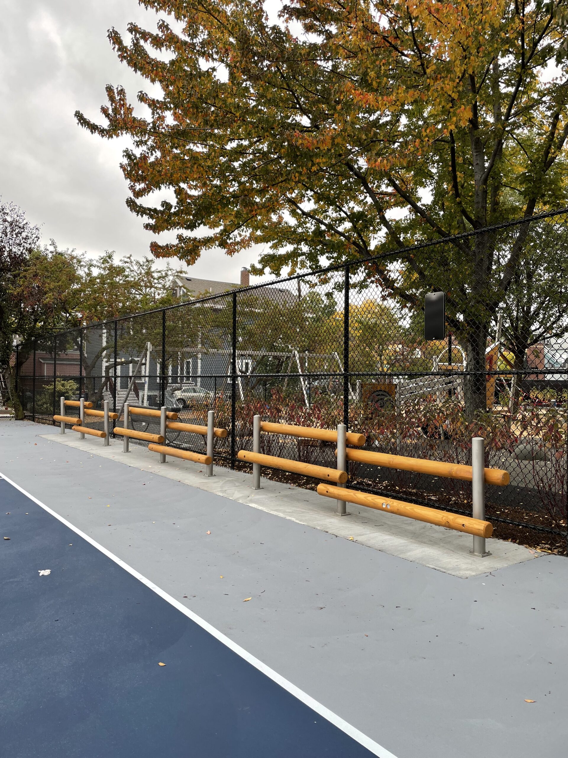 The wooden log bench is a distinctive seating piece that blends functionality with natural aesthetics. Its design, with two horizontally placed logs at varying heights, offers users both the opportunity to sit and lean, providing a comfortable and versatile resting space. This bench also enhances the overall aesthetic of a playground, creating a more organic and unique environment compared to traditional bench designs. The rustic charm and natural appeal of the wooden logs can make any outdoor area feel more inviting and connected to nature.