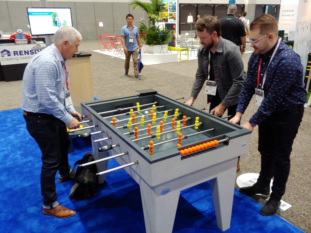 Our Foosball Table is made of long-lasting environmentally-friendly, polymer concrete, so it can stand up to the elements. This table made by Maillith is the ideal toy for schoolyards, inter-generational play, outdoor recreation, playgrounds or parks. Trade show display has orange and yellow players.