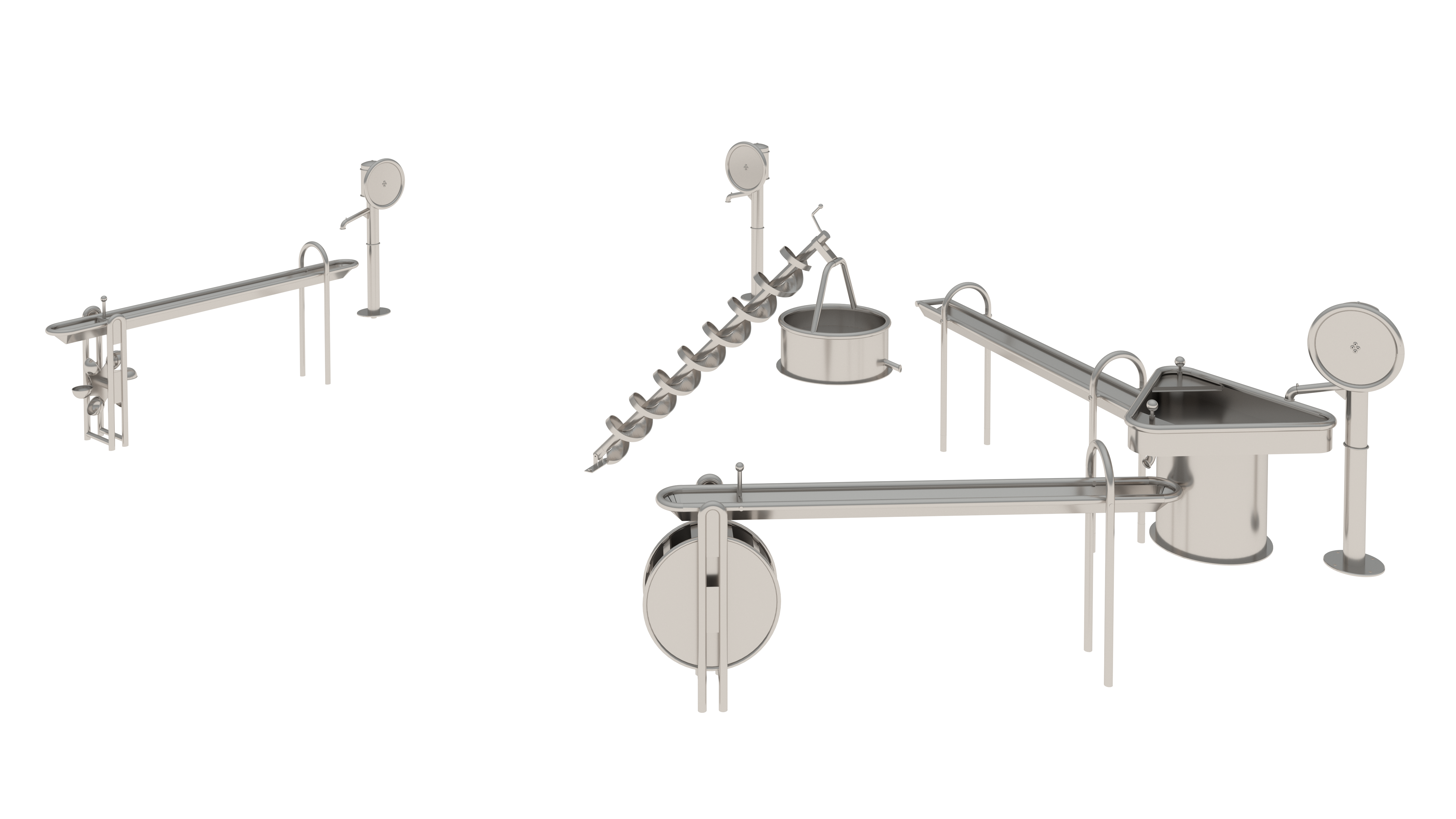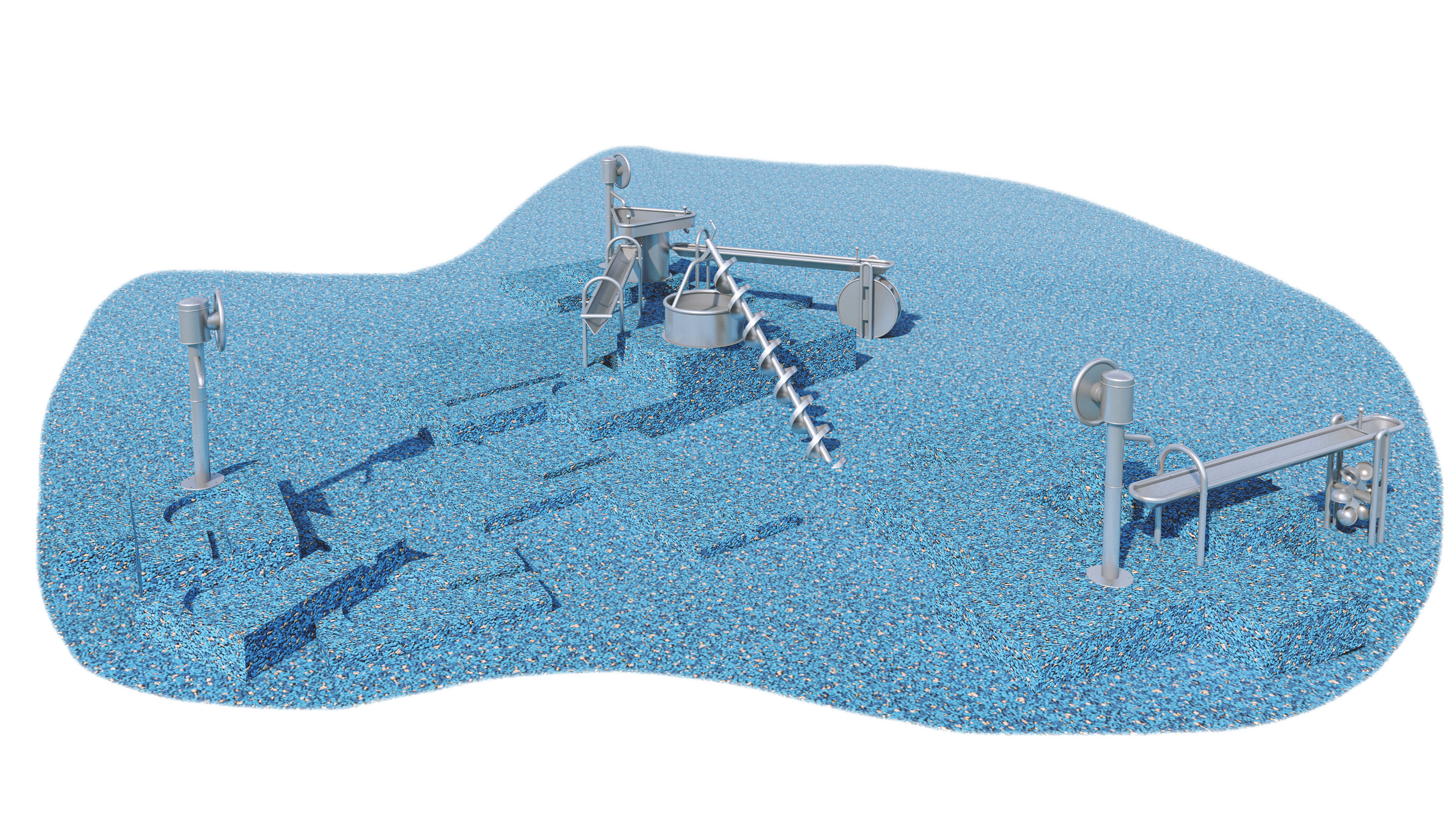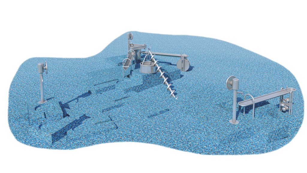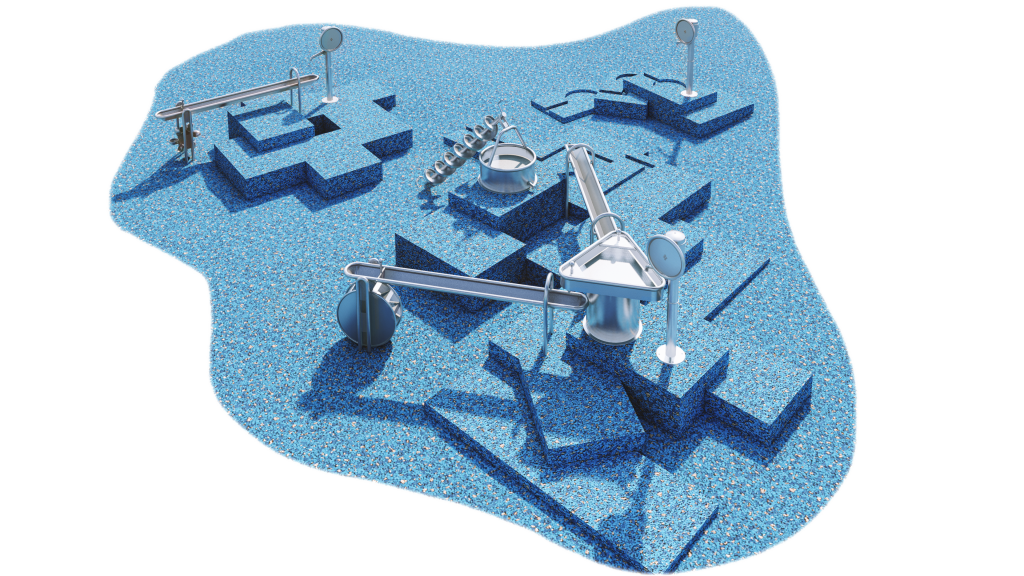 Ideal for a playscape with an integrated reservoir as the base, Narrows provides a series of distinct play areas rising up from the water below, each mimicking different natural systems. Incorporating a triangular water reservoir with dams, multiple winder pumps, channels, mills, and an Archimedes screw—opportunities abound for group or individual exploration and play. Highly sensory, endlessly engaging, and technically stimulating, children can move from station to station and discover various ways of moving, damming, and conveying water throughout the site. A beach, a creek, a waterfall, and any other natural setting you wish to imagine in one water-filled place.