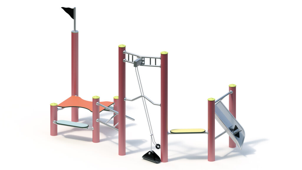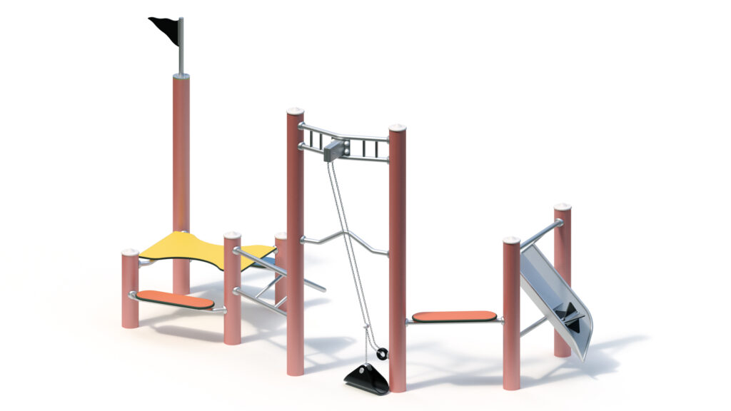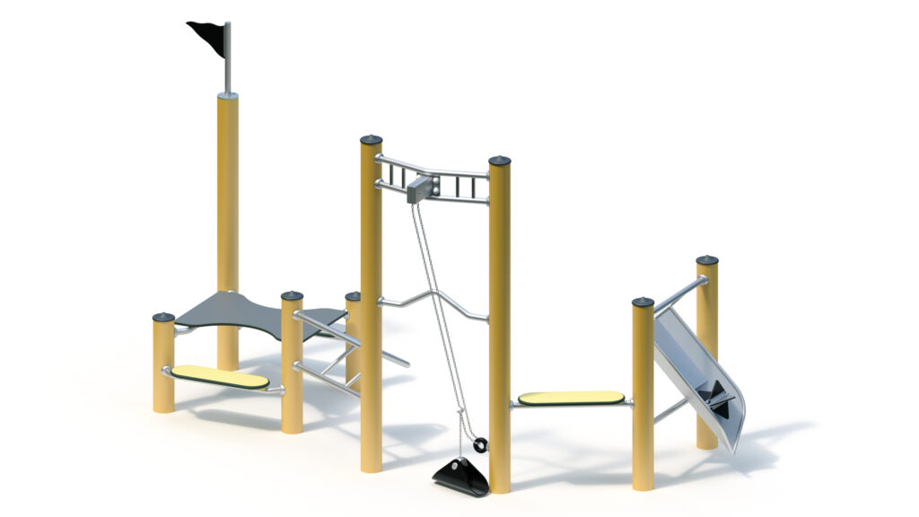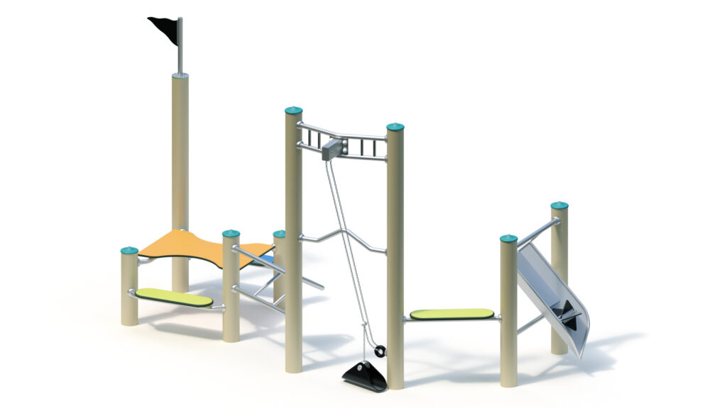 With a multitude of climbing structures in a combination of materials, heights, and configurations, the climbing combo offers kids across the age spectrum (over 5 years old) almost endless ways to reach the top. From horizontal bars to a vertical net or even a diagonal climbing deck, both daring and cautious kids will find suitable opportunities to clamber and climb this multidimensional unit. The stainless steel elements are built to last, and multiple color options are available for post caps and the climbing net.
